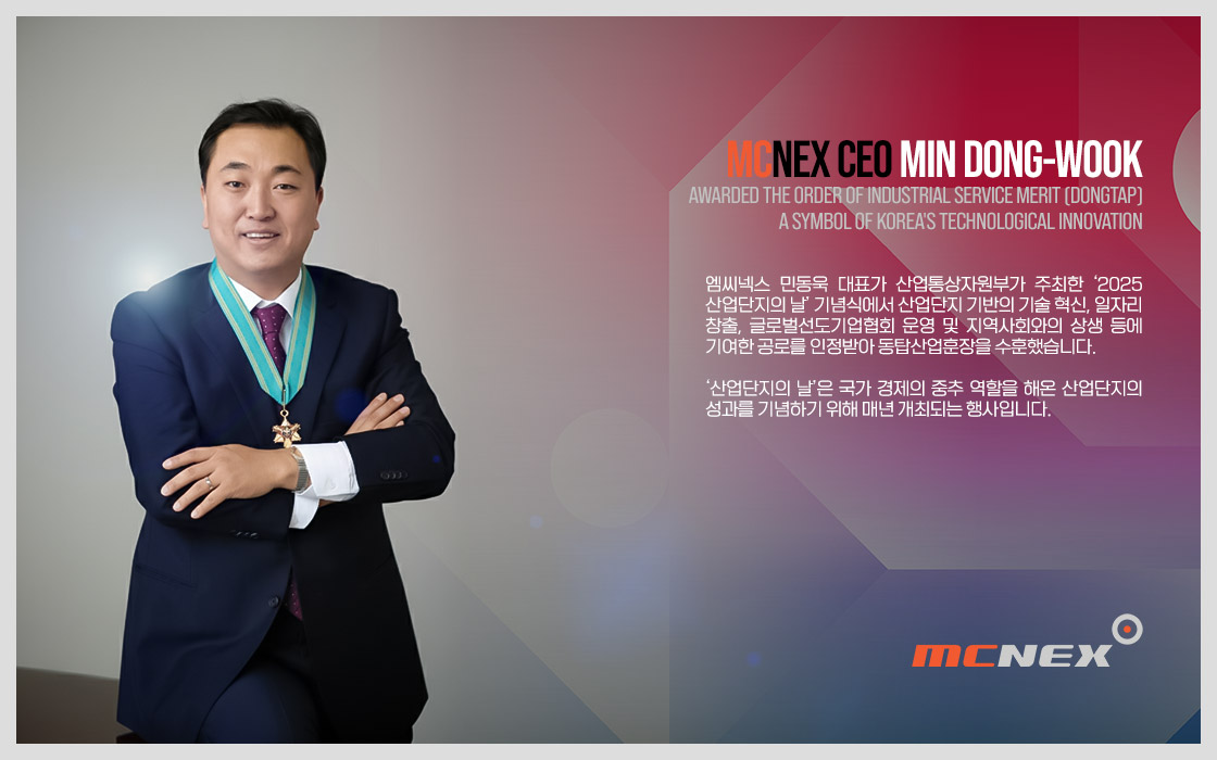 엠씨넥스 민동욱 대표가 산업통상자원부가 주최한 ‘2025 산업단지의 날’ 기념식에서 산업단지 기반의 기술 혁신, 일자리 창출, 글로벌선도기업협회 운영 및 지역사회와의 상생 등에 기여한 공로를 인정받아 동탑산업훈장을 수훈했습니다. ‘산업단지의 날’은 국가 경제의 중추 역할을 해온 산업단지의 성과를 기념하기 위해 매년 개최되는 행사입니다.