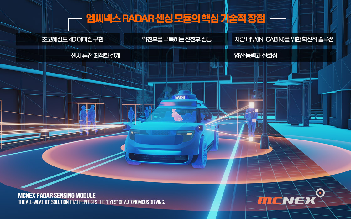 -엠씨넥스는 세계 최고 수준의 카메라 모듈 기술을 보유한 기업입니다. 우리는 단순히 개별 센서를 공급하는 것을 넘어, Radar와 카메라의 데이터를 가장 효율적으로 융합하는 방법을 깊이 이해하고 있습니다.